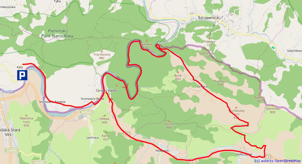 Wycieczka ta niestety wymaga użycia samochodu, który zostawiamy w Kątach na parkingu Spływu Dunajcem. Z Kąt udajemy się malowniczą szosą do Sromowców Niżnych gdzie przekraczamy Dunajec kładką pieszo-rowerową na stroną słowacką. Stąd kawałek szosą do Czerwonego Klasztoru gdzie zaczyna się najbardziej malownicza część spływu – Stara Droga Pienińska. Wybudowana w XIX wieku przez Polaków (m.in. przez krakowską Akademię Umiejętności) do dziś dobrze służy turystom. Więcej o historii tej drogi można przeczytać tutaj. Odcinek od Sromowców Niżnych do Szczawnicy w sezonie jest bardzo uczęszczany więc należy zachować szczególną ostrożność. W Sromowcach Niżnych można wypożyczyć przyczepki do roweru dla dzieci. Można wtedy przejechać Drogę Pienińską do Szczawnicy i z powrotem. Część trasy jest wytyczona po stronie słowackiej więc należy pamiętać o zabraniu dokumentów uprawniających do przekroczenia granicy.