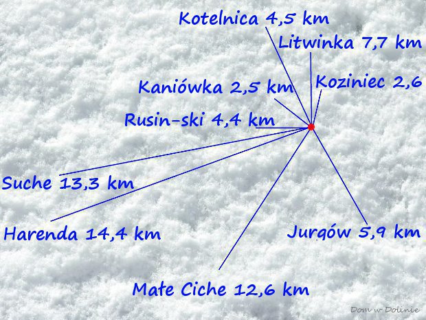 Pokoje „W Dolinie” znajdują się w samym sercu największego polskiego kompleksu narciarskiego obejmującego 9 dużych stacji narciarskich. Wszystkie stacje narciarskie wyposażone są w nowoczesne wyciągi krzesełkowe, instalacje do sztucznego naśnieżania oraz urządzenia do maszynowego przygotowania tras.